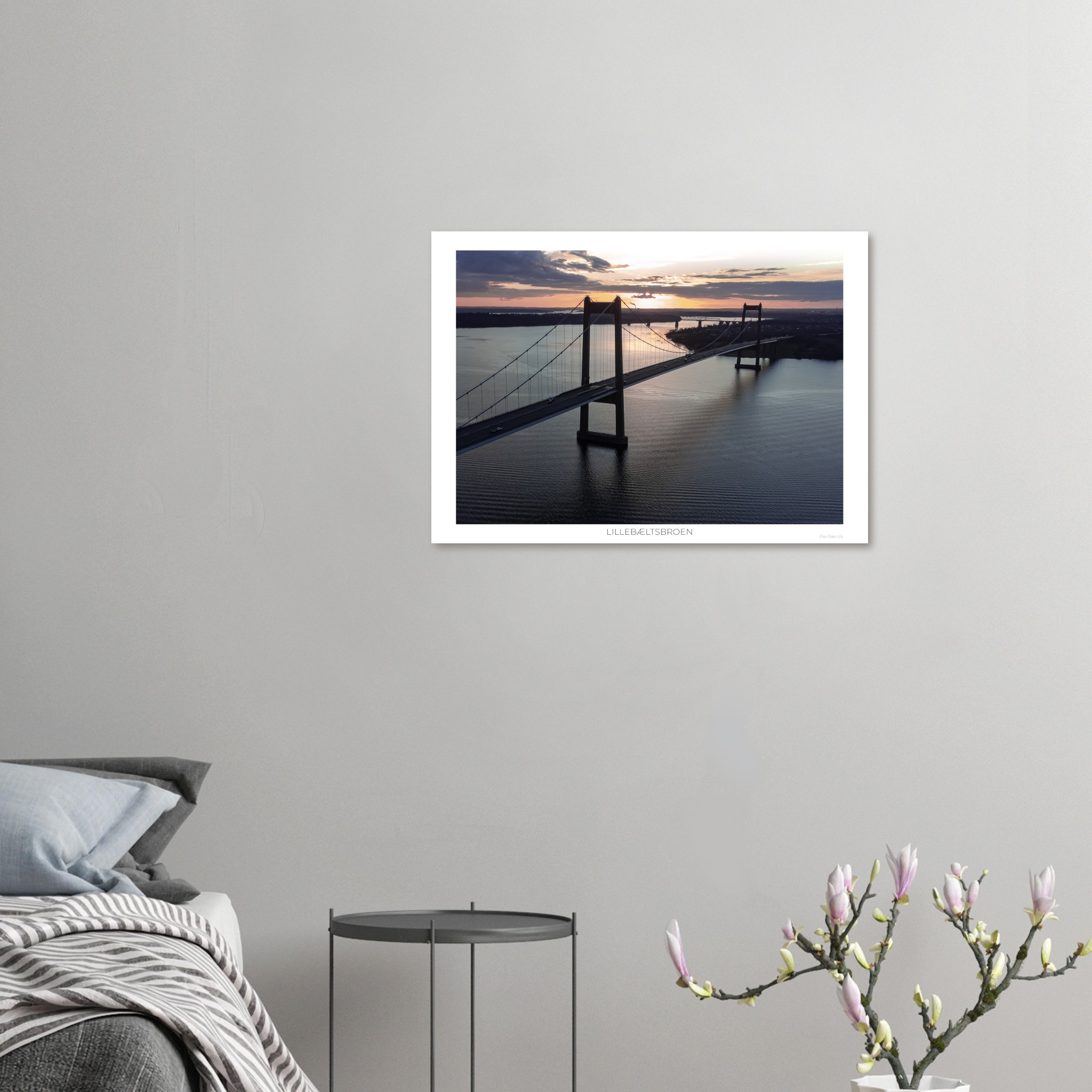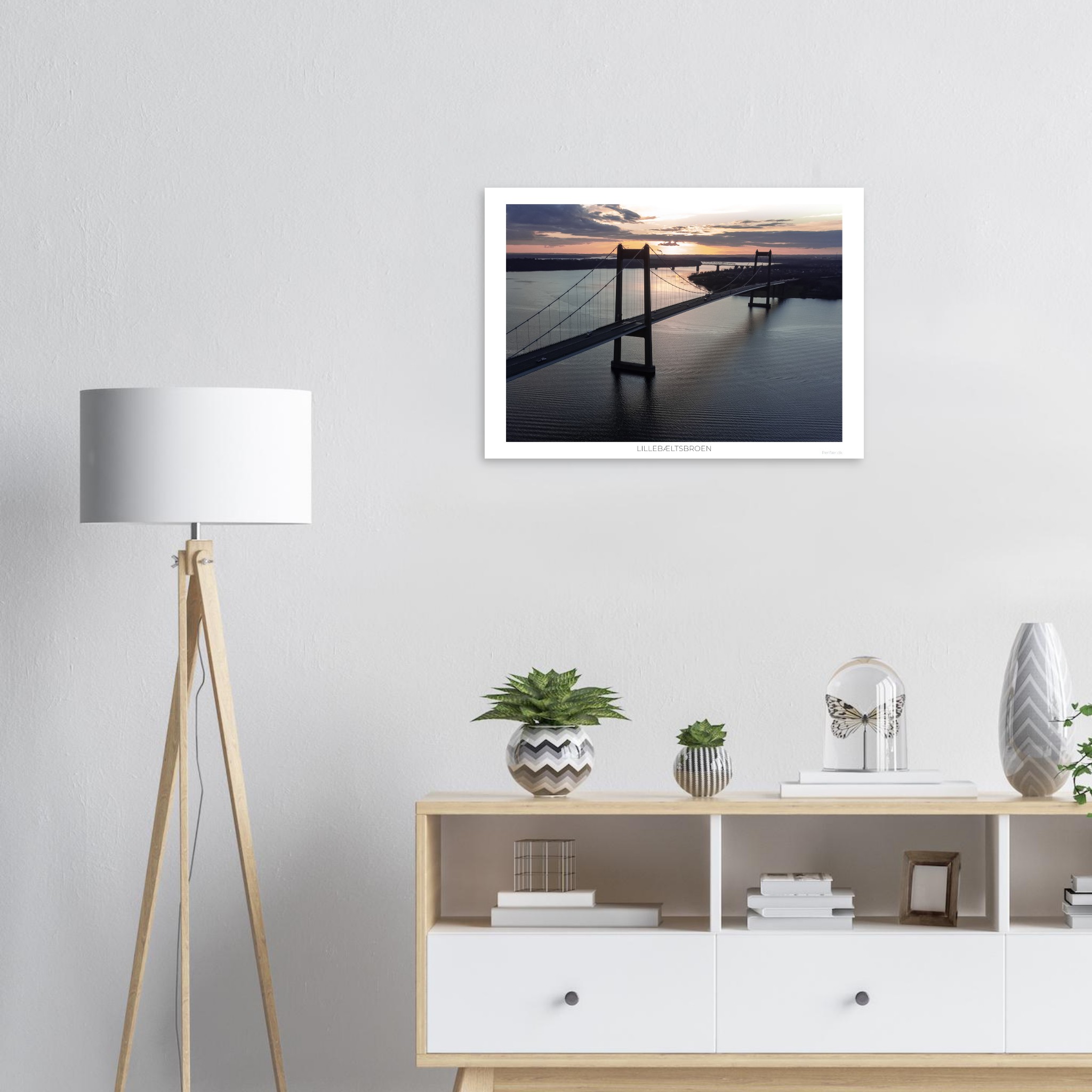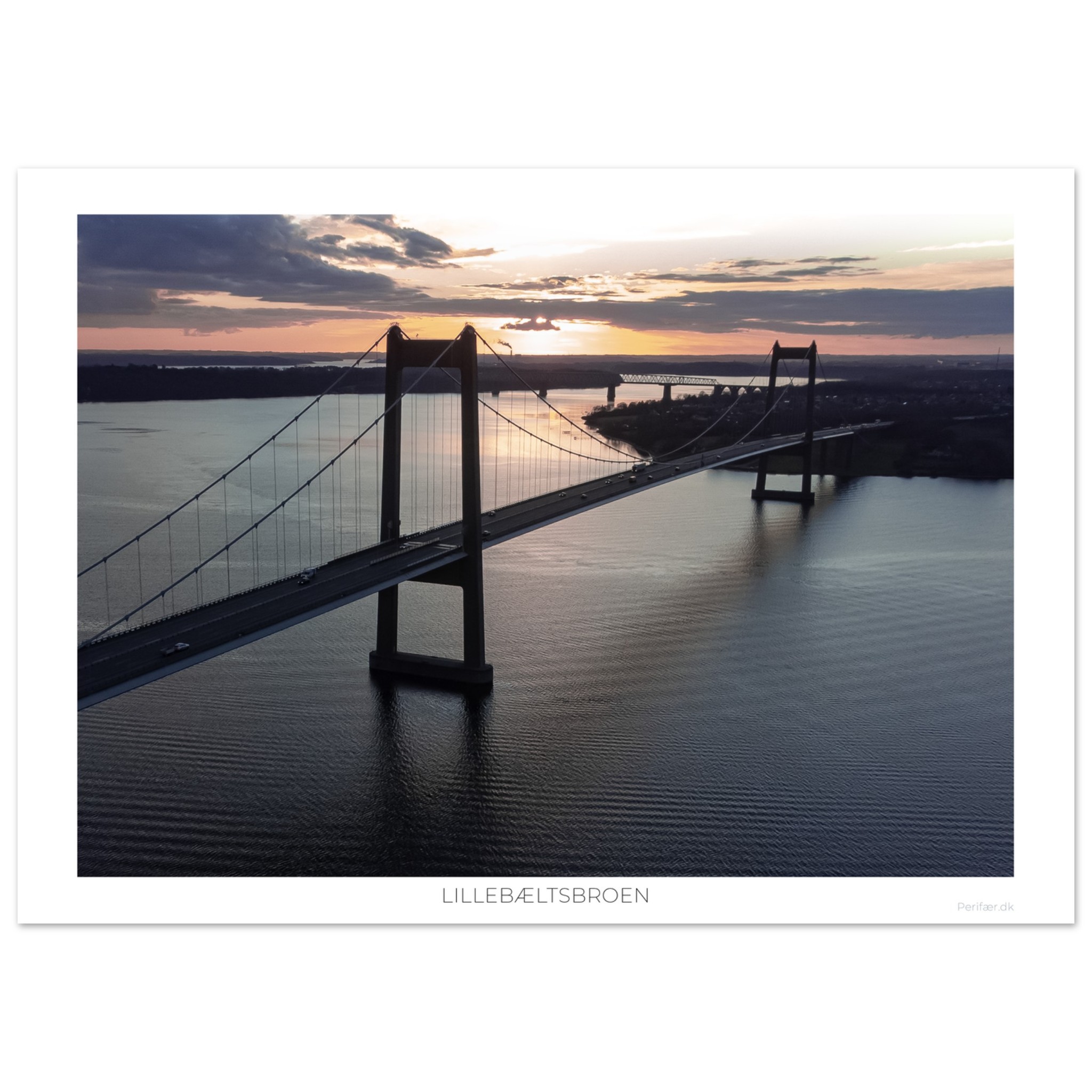 Lillebæltsbroen set fra Strib en tidlig efterårsaften, hvor lyset over vandet virkelig viser, hvad det kan. I baggrunden ser man den historiske, gamle lillebæltsbro, og hvis man står på tæer, kan man ane silhouetten af Skærbækværkets skorsten i kontrast mod efterårshimlen.